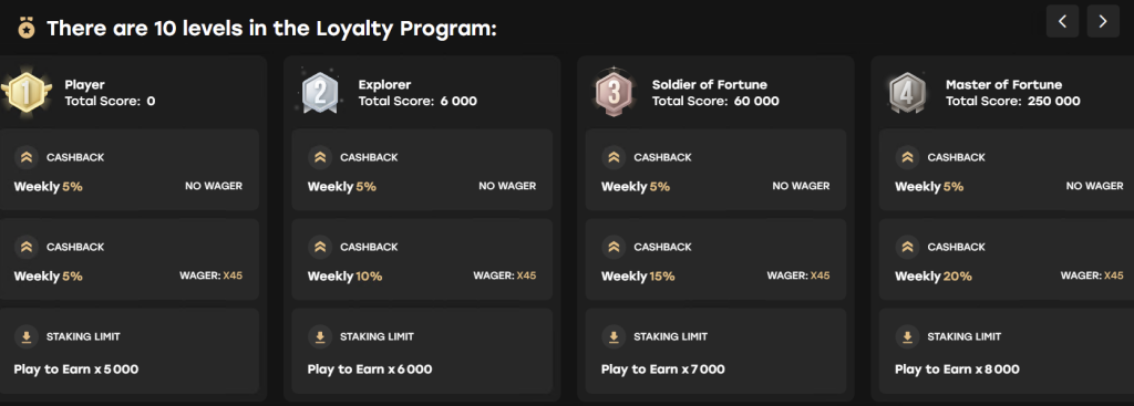 Lojalitetsprogrammet hos Fairspin är ett av de mest transparenta i branschen. Det bygger på 10 tydliga nivåer där varje nivå ger stegvis bättre belöningar.